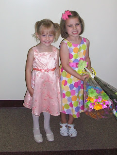 On Thursday, May 27th, Katie graduated from Kids Connection Preschool. The program was very cute; each kid participated in a song performance. Katie sang and danced in 10 Little Fish. Delaney danced through the entire thing, and Rowena wouldn't sit still. I was so proud of Katie...she did such a great job. She was a little shy/weird/stand-off'ish when saying "goodbye" to Mrs. Lewis--her teacher for two years. I think she really had a hard time knowing that she would be in a new school next year, with a new teacher, and new classmates.