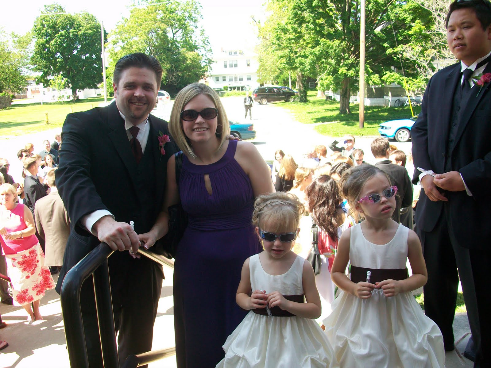 Around 9/9:30, the girls were getting a little tired, especially Rowena who took about 2-3 naps on me throughout the reception (and several with Peter in the car before, during, and after the ceremony). So, we headed out around 9:30. It was getting dark and it had been a very event-filled day. On the ride home we stopped to pick up some gatorade (what our kids live off of when sick). Katie was complaining of a sore throat and saying she didn't feel good. Well, about 3 minutes from the hotel, we hear a huge splash...turn around to see a very scared look on Katie's face...and vomit all over her. Poor girl! We got back to the hotel, gave her a bath, put Rowe to bed, gave Delaney a breathing treatment and all of her medicine, and then let them fall asleep in their big bed. Phew...it was over. All three girls threw up in about an 36 hour time-frame, all have had coughs and/or fevers...but they did WONDERFUL at the wedding and had a GREAT time at the reception. Oh, I did forget one thing--Delaney cried through the entire wedding ceremony...first because she wanted to hold Rowena (who Pete took out of the church because she was too fussy) and then because