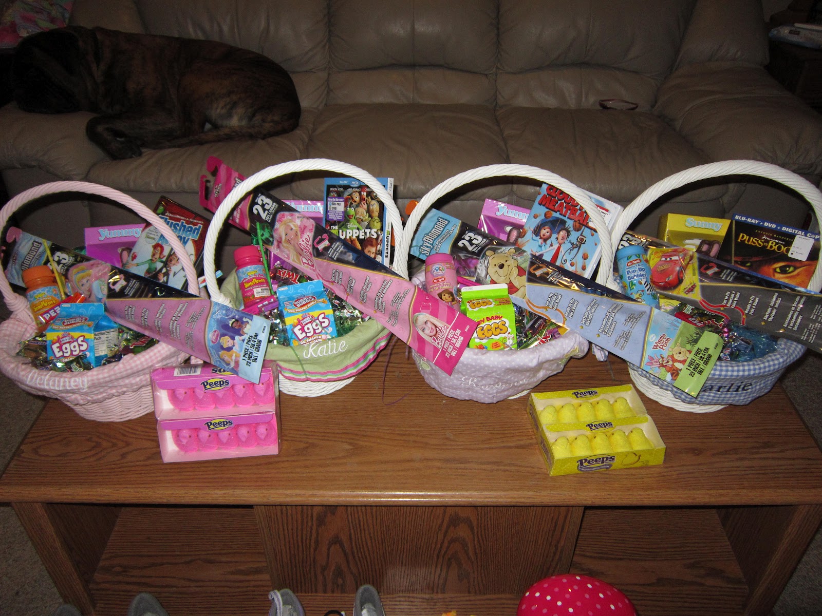 The usual, traditional Henderson baskets: chocolate bunny, candy galore, kites, and movies